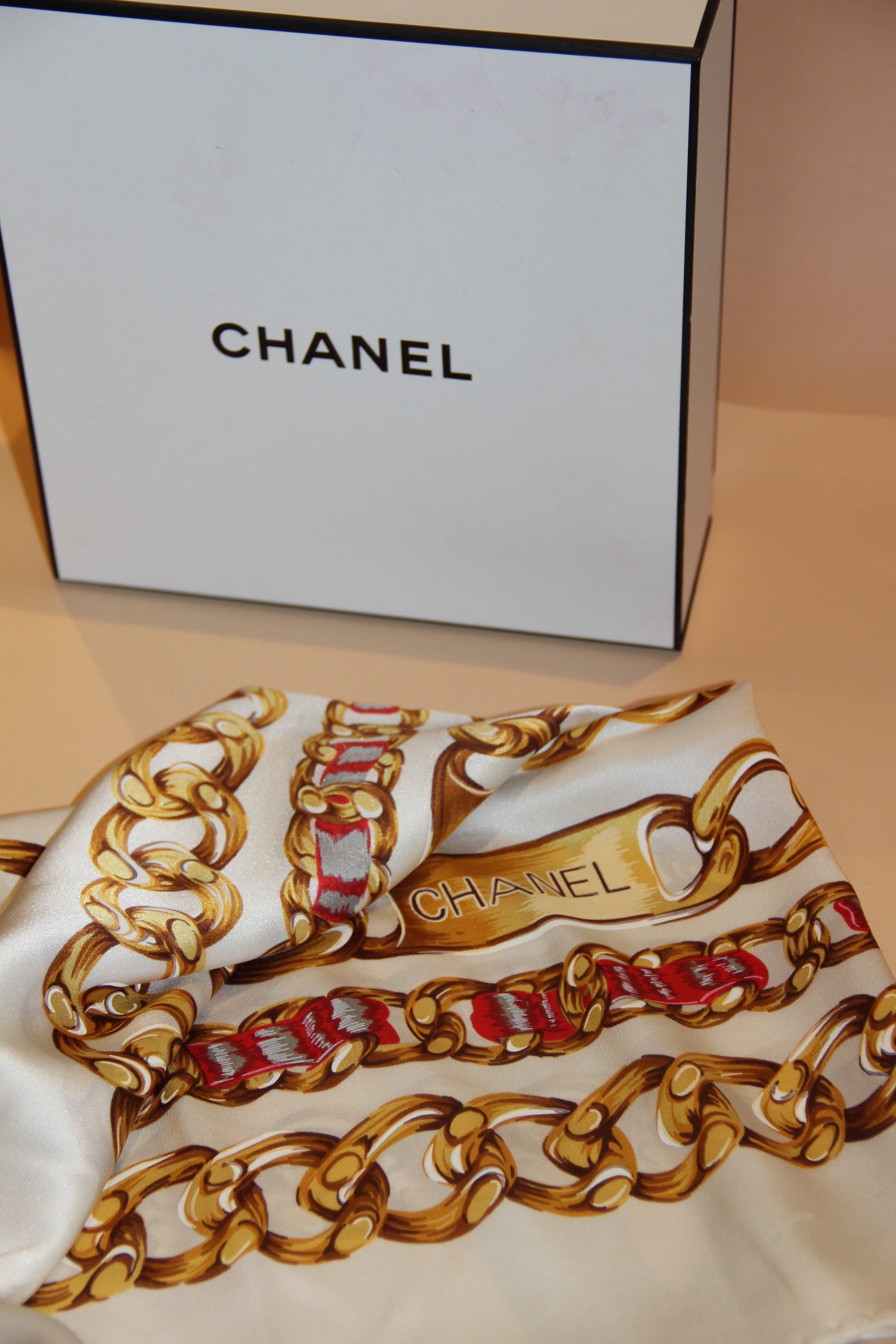 Une pièce très appréciée des collectionneurs et amateurs de carrés Chanel Vintage, vendu avec une boite Chanel.