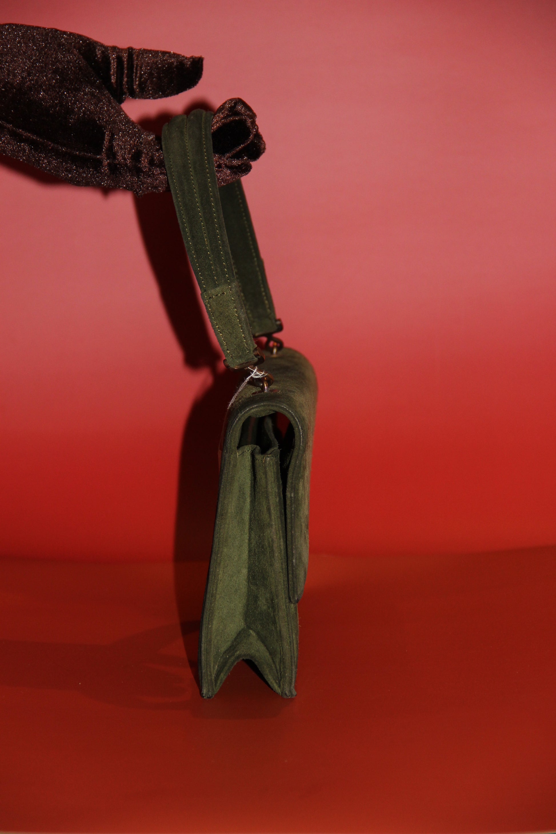 Rare et élégant ensemble Hermès vintage, composé d’un sac à main modèle Palonnier et de sa paire de gants assortis, réalisés en veau doblis (veau de glisse) de couleur kaki, datant des années 1960.