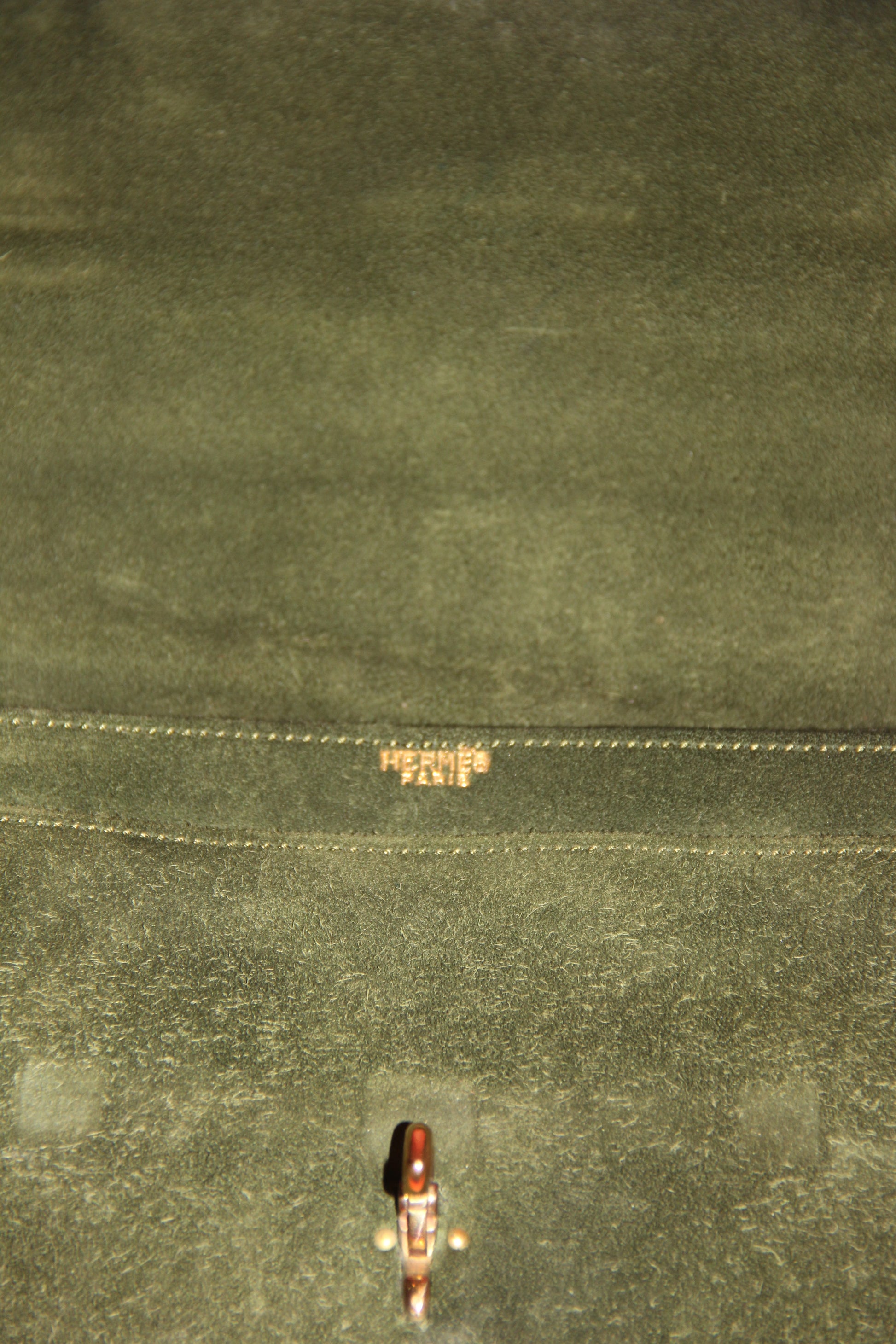 Lot très rare : sublime sac à main "Palonnier" en veau doblis kaki de la maison Hermès - Thème Circa 1960 vintage, véritable pièce de collection avec doublure en agneau vert - bijouterie en métal plaqué or.